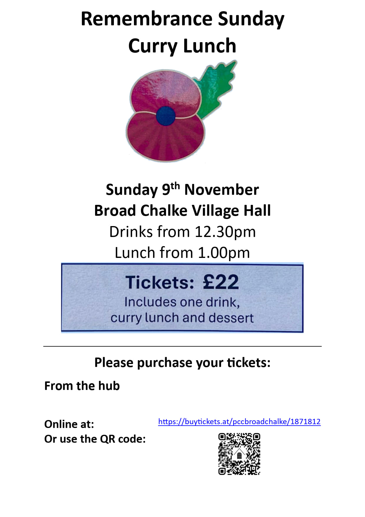 Please do join us for the Broad Chalke Remembrance Sunday Curry Lunch on Sun 9th November.  This event is open to ALL ages in our community.
